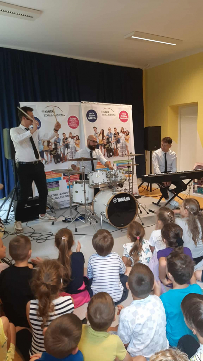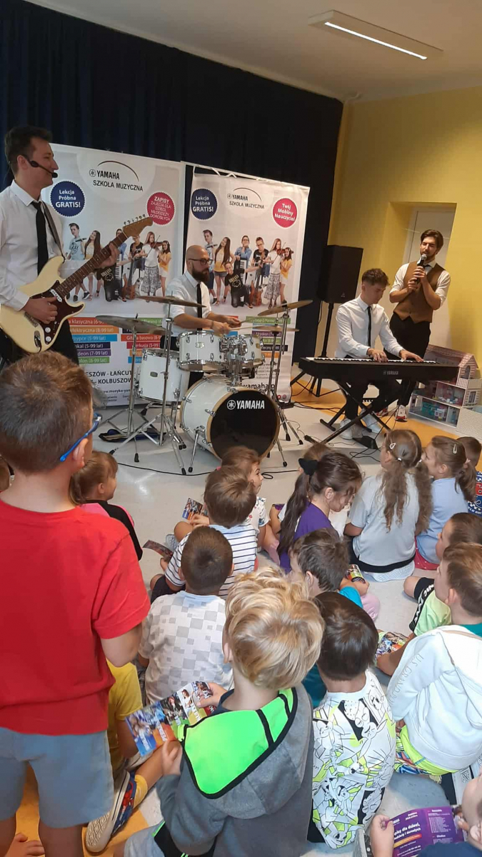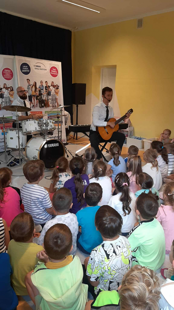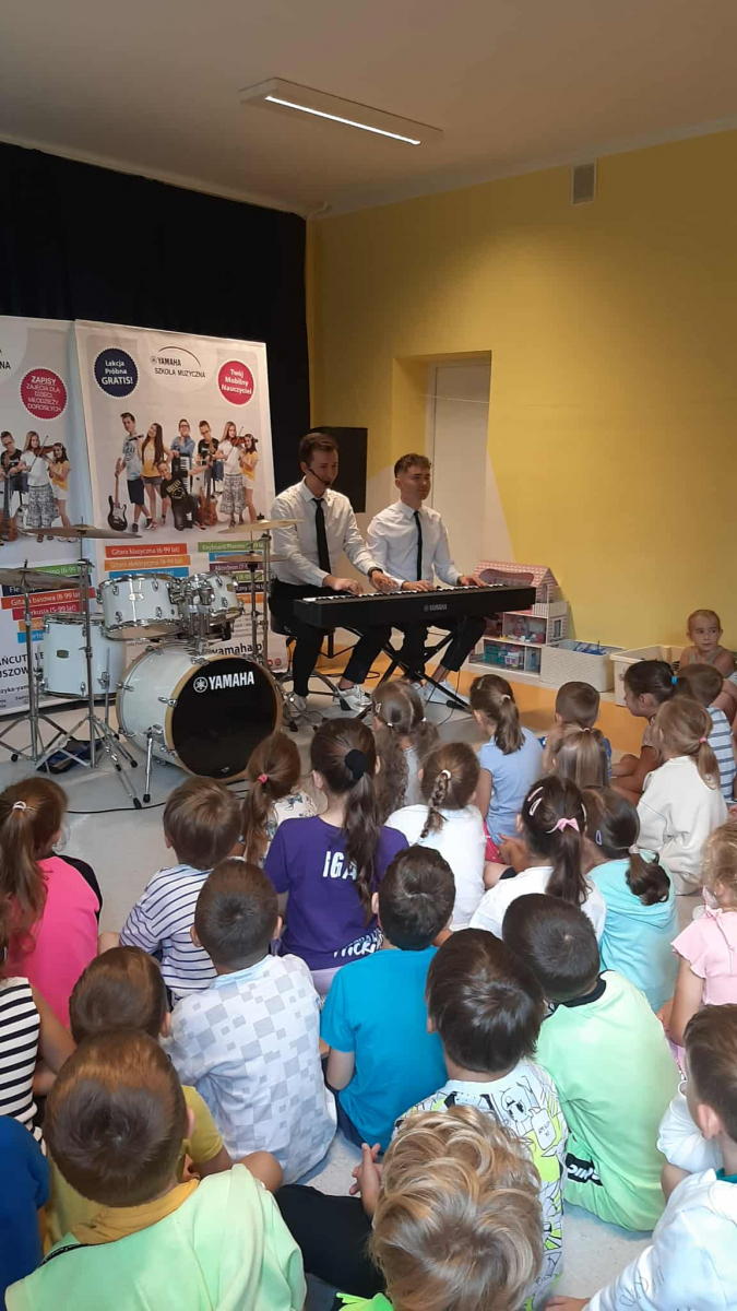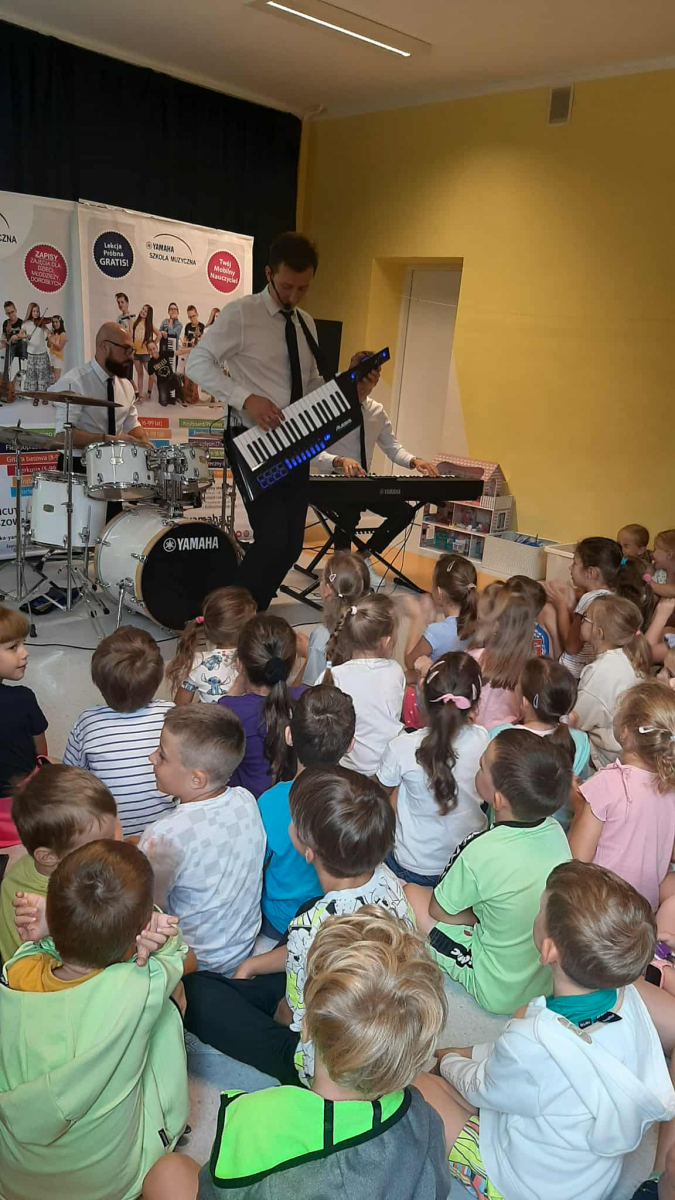 W dniu 05.09.2025 w naszym przedszkolu gościliśmy muzyków ze szkoły muzycznej Yamaha. Podczas audycji muzycznej zaprezentowano instrumenty takie jak: gitara klasyczna, gitara elektryczna, pianino, keyboard i perkusja. Dzieci z uwagą wysłuchały brzmień różnych instrumentów oraz utworów należących do muzyki klasycznej, rozrywkowej, a także utworów dziecięcych. To żywe spotkanie z muzyką zaowocowało wielkim zainteresowaniem instrumentami i gatunkami muzycznymi wśród dzieci. Zachęcamy nasze przedszkolaki do odkrywania swoich talentów muzycznych oraz życzymy im wytrwałości w podejmowaniu trudu nauki gry na instrumentach.