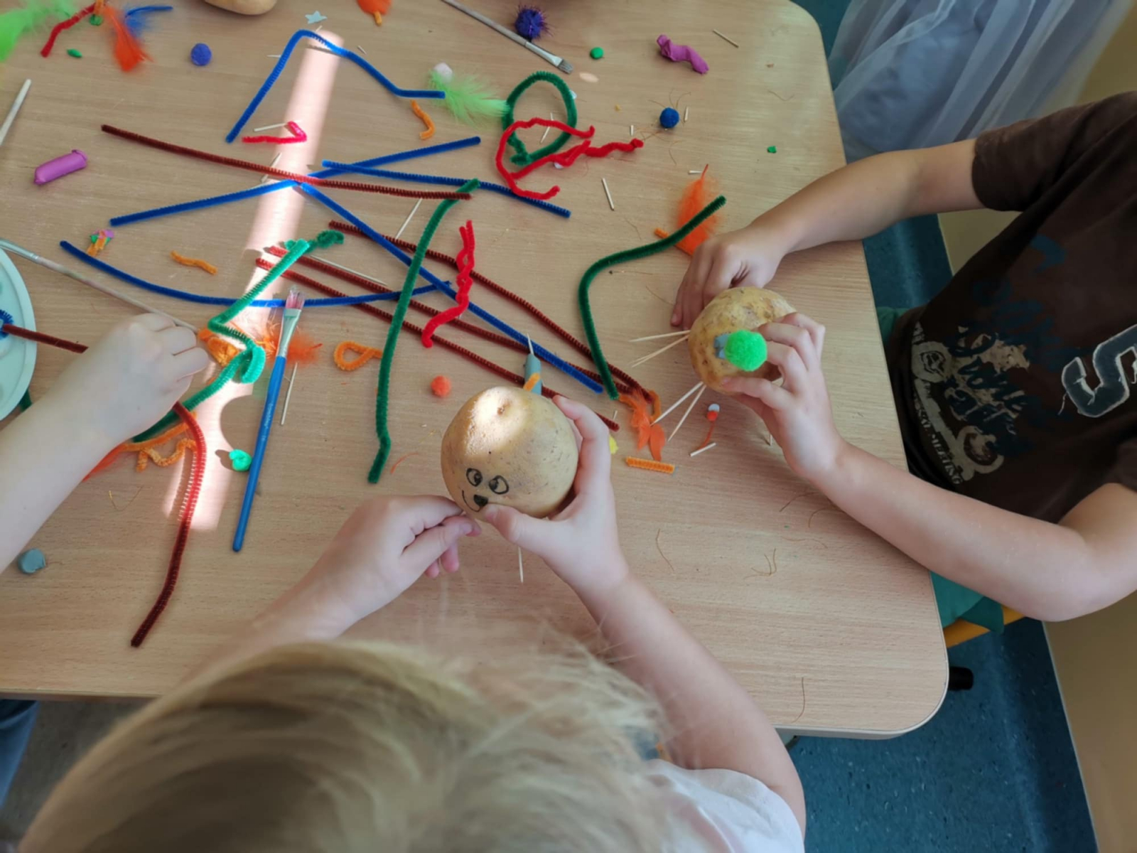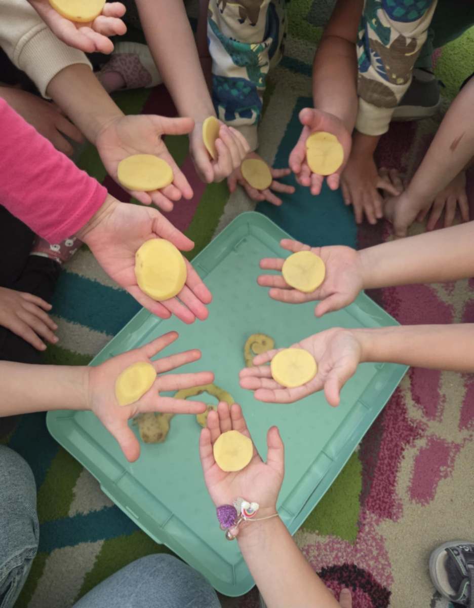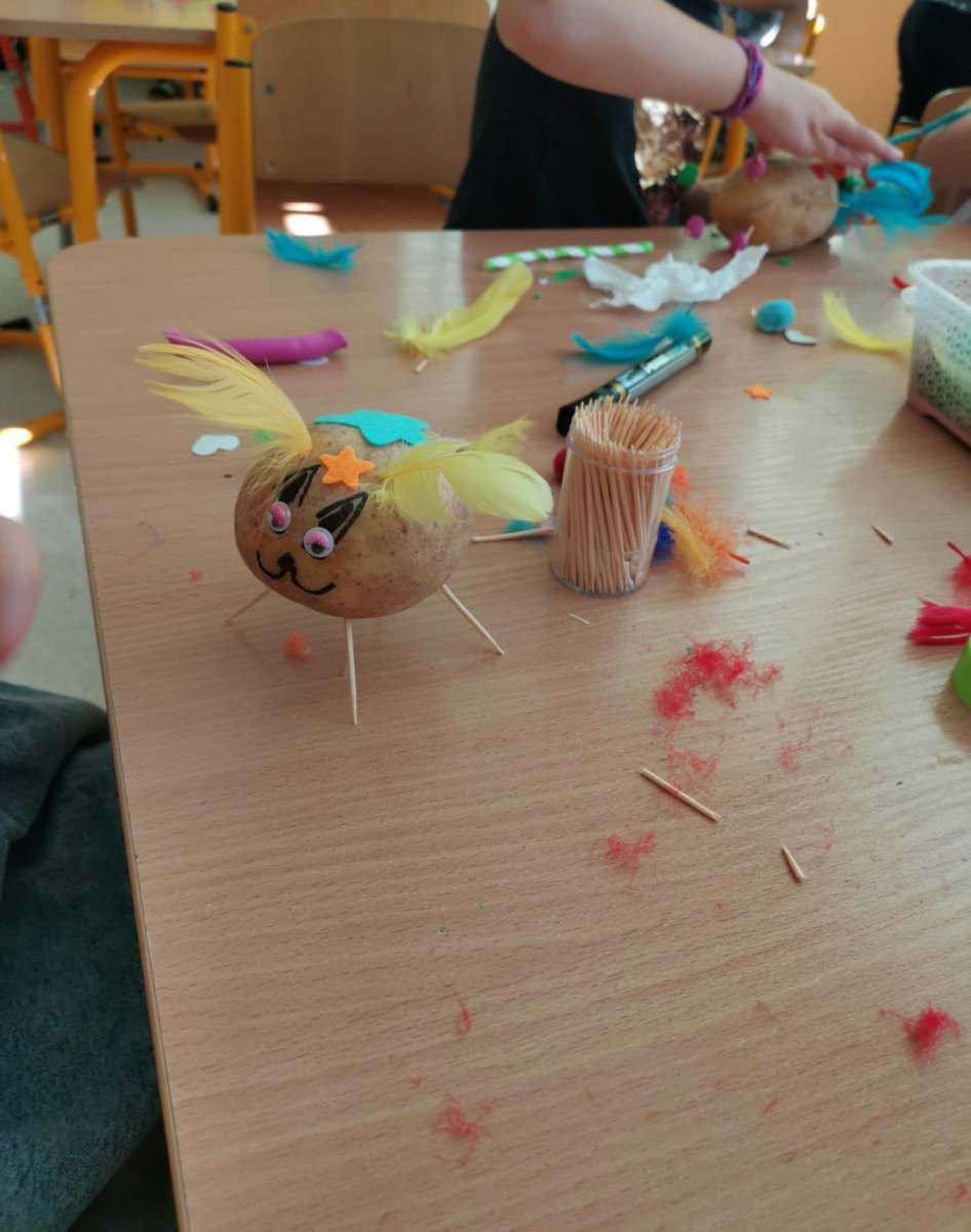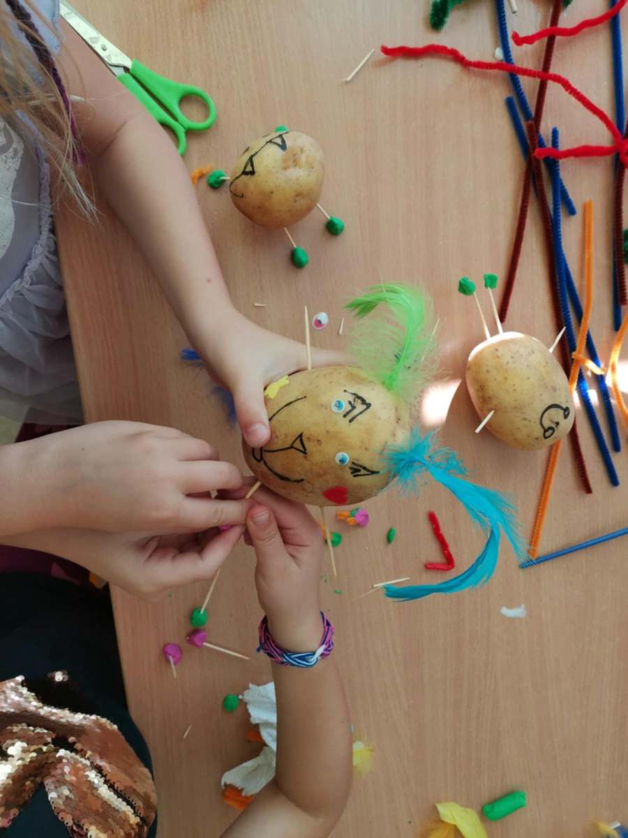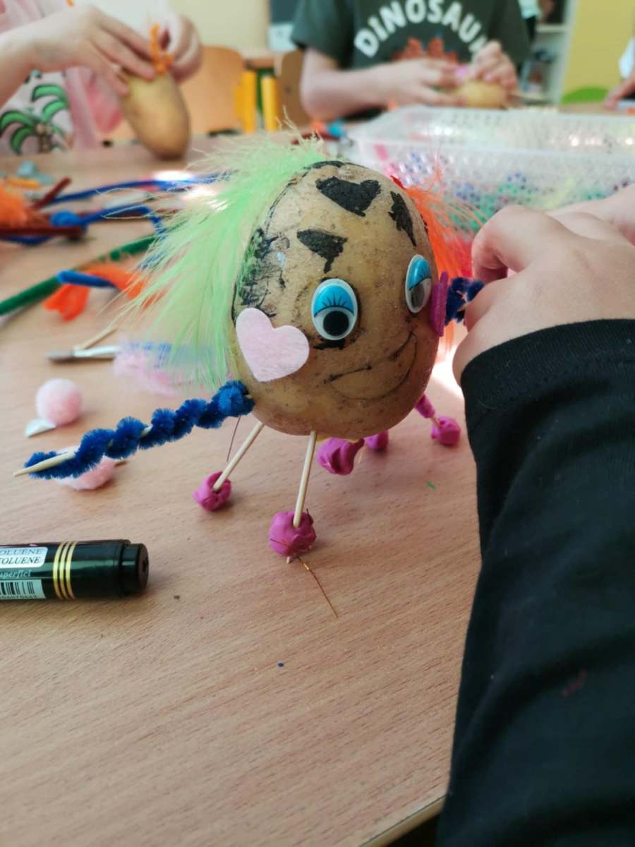 Zabawy i zajęcia w tym dniu skoncentrowane były wokół ziemniaka. Dzieci rozmawiały o walorach zdrowotnych tego warzywa i dowiedziały się, jak wszechstronnie można je wykorzystać w kuchni. Dodatkowo, przedszkolaki miały okazję wykonać prace plastyczne, w których wykorzystały same ziemniaki.