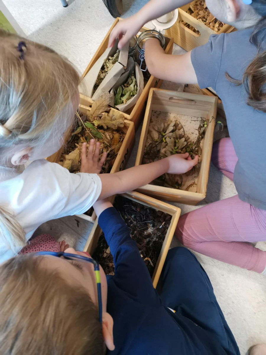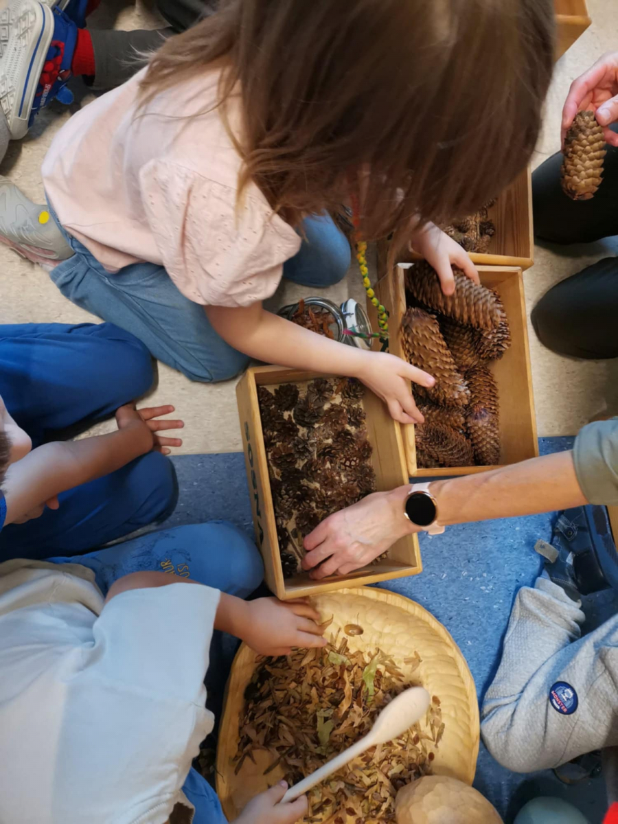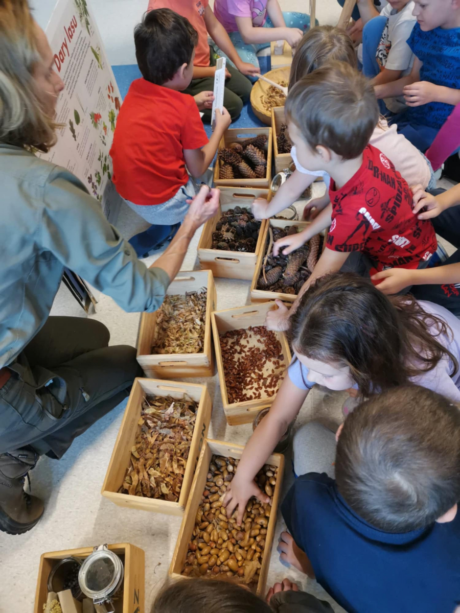 Nasz gość opowiedział o roślinności występującej w lesie. Przedszkolaki uczyły się rozpoznawania i nazywania liści drzew oraz ich owoców. Pani Marta przypomniała dzieciom o zwierzętach mieszkających w lesie, opowiedziała na czym polega praca leśnika oraz utrwaliła zasady zachowywania się w lesie.