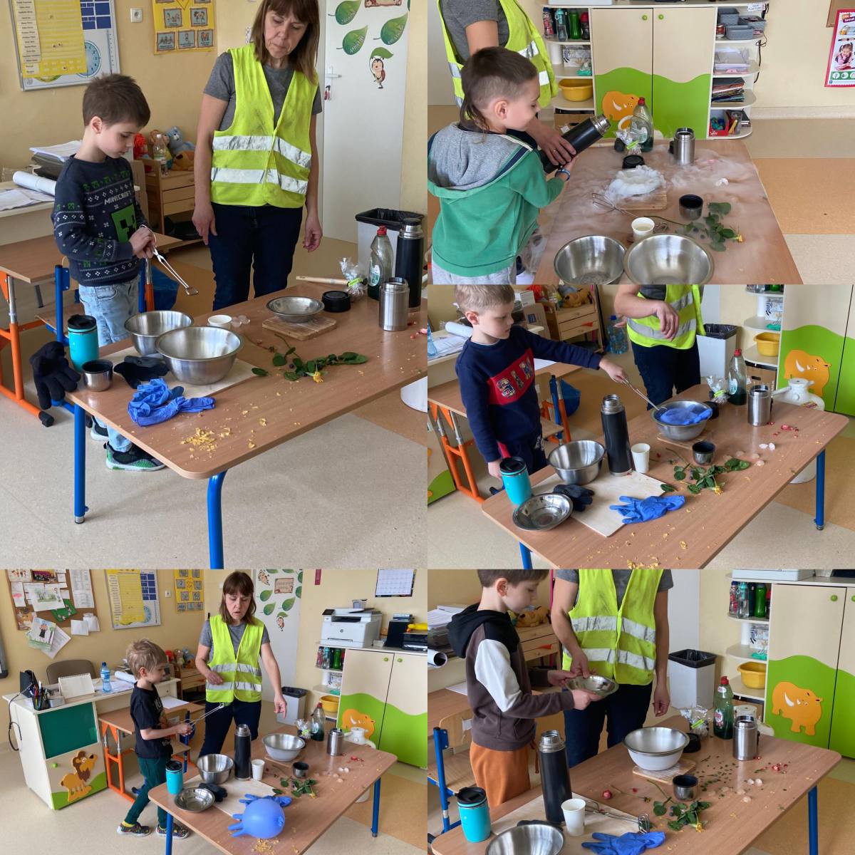 Za nami kolejne spotkanie z Panią Agnieszką z WooHoo Forest. Tym razem „Biedroneczki” wykonywały ciekawe doświadczenia związane z ekstremalnie niskimi temperaturami i zjawiskami, jakie można pokazać za pomocą ciekłego azotu. Co prawda w domu się tego nie przeprowadzi ale warto zobaczyć jakie właściwości ma ciekły azot i czym tak naprawdę jest. Wykorzystanie ciekłego azotu to bardzo interesujące pokazy, które zadziwiają każdego kto je zobaczy. Nasze przedszkolaki zobaczyły jak wygląda dewer, w jaki sposób szybko zamrozić truskawki, borówki, pierniki, szpinak i jak wyglądają po odmrożeniu, czy tracą właściwości jak po zwykłej zamrażarce. Przekonały się, co się dzieje z kwiatami pod wpływem ciekłego azotu i jak w szybki sposób zamrozić bańki mydlane. Doświadczenia z ciekłym azotem należy przeprowadzać ostrożnie i trzeba znać jego właściwości aby nie zrobić sobie krzywdy. U nas wszystkie pokazy były pod kontrolą Pani Agnieszki i dzięki temu dzieci mogły się przekonać jaką moc ma ekstremalnie niska temperatura – 195,8 °C.