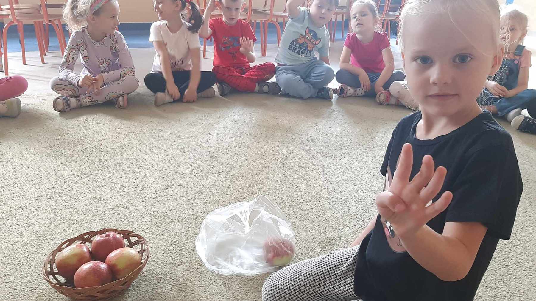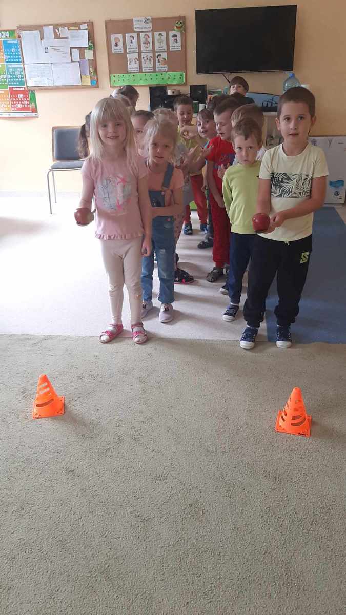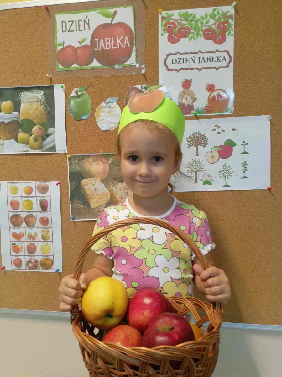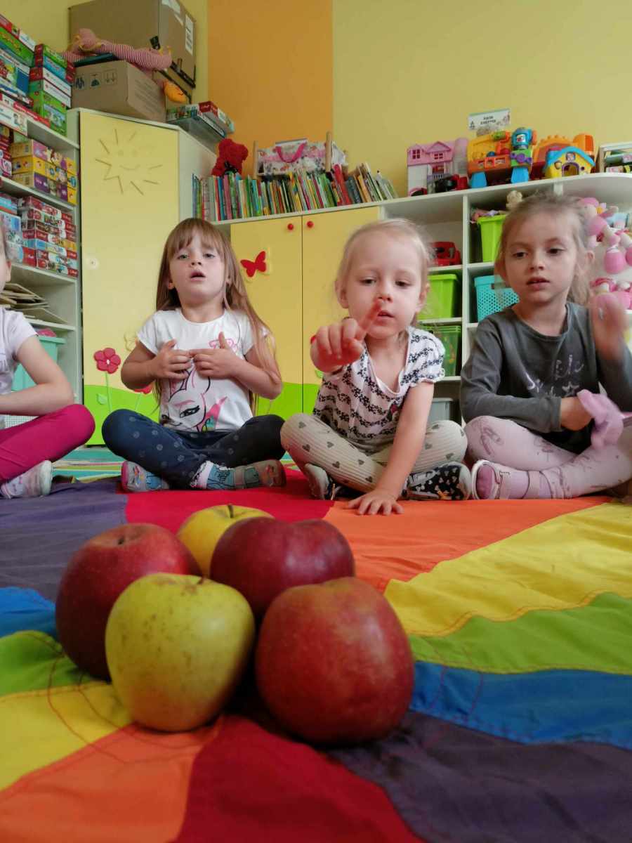 W dniu 27 września obchodziliśmy w naszym przedszkolu „Dzień Jabłka”. Dzieci z grupy „Żabek” i „Biedronek” rozpoznawały i określały kształt, zapach, kolor oraz smak jabłek. Ponadto wzbogacały swoją wiedzę z zakresu walorów zdrowotnych tych smacznych owoców, a także poznały możliwości ich przetwarzania. Wszystkie zabawy tego dnia dominowały pod znakiem jabłka – były piosenki, tańce, zagadki i działania matematyczne. Dzieci świetnie poradziły sobie z przeliczaniem oraz porównywaniem jabłek. Z chęcią wykonały pracę plastyczną a najwięcej emocji dostarczyły im konkurencje zręcznościowe i ćwiczenia ruchowe.